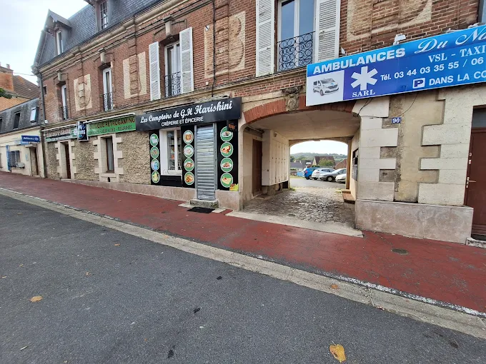 Il est situé entre la toilleteuse et un petit magasin alimentaire avec guirlandes lumineuses. Un grand panneau ambulances est accroché sur le porche. Vous trouverez Allianz juste à côté.