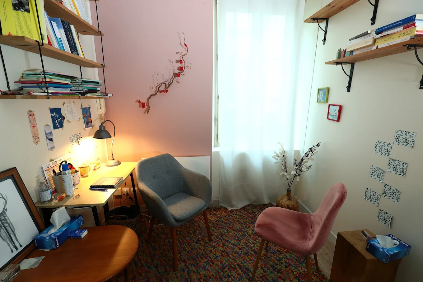 Au cabinet, je propose un accompagnement pour adultes et adolescents, je vous accueille dans un cadre confidentiel les lundis, sur rendez-vous.