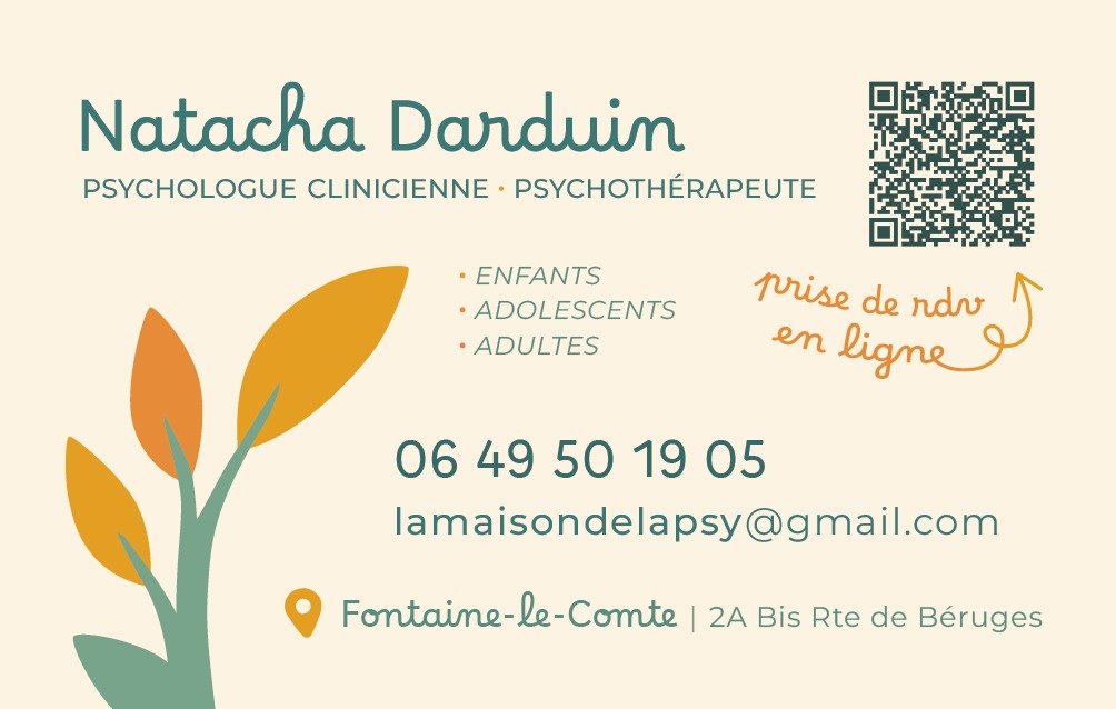 Bonjour, je m’appelle Natacha Darduin. Psychologue clinicienne et psychothérapeute depuis 2010, je vous accueille à partir du 10 octobre 2025 sur la commune de Fontaine le Comte à 5 mn de Poitiers Sud dans mon nouveau cabinet : La Maison de la Psy.