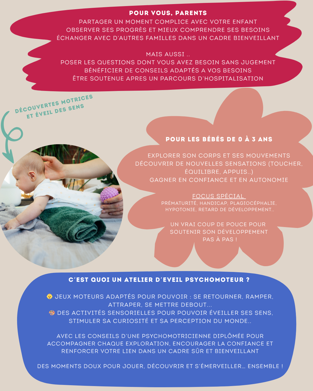 Ces ateliers sont pensés pour aider votre bébé à se développer en confiance, de manière respectueuse et stimulante, tout en vous donnant des repères clairs à reproduire à la maison.